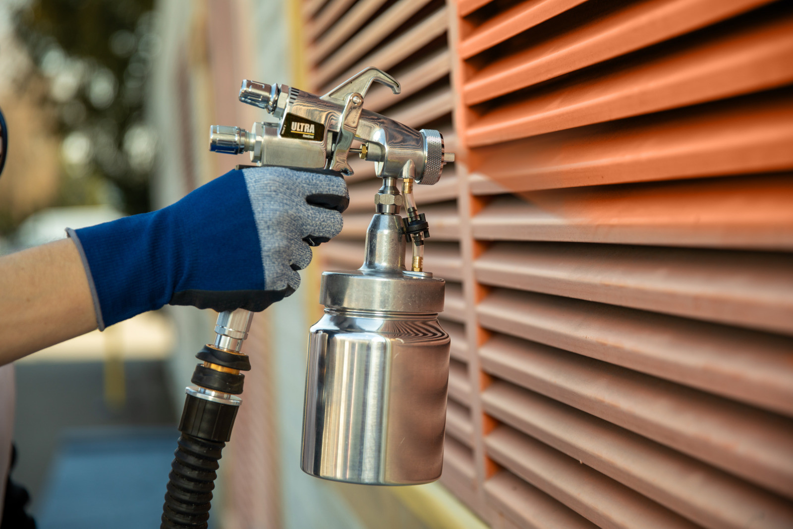 Mit der lösemittelbeständigen HVLP-Pistole Ultra arbeitest Du jederzeit präzise und kontrolliert. Dank ergonomischem Design bleibt das Sprühen auch bei längeren Einsätzen komfortabel und ermüdungsfrei. Die stufenlose Luft- und Materialmengenregulierung ist direkt an der Pistole angebracht – so kannst Du alle Einstellungen flexibel und direkt am Objekt vornehmen.