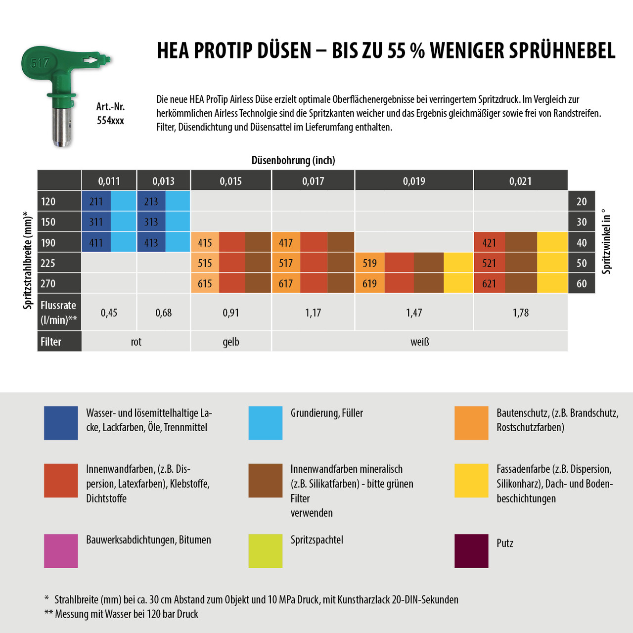 Die HEA ProTip Düsen sind revolutionäre Airless Düsen von WAGNER und eignet sich für ein breites Materialspektrum wie von Grundierungen, Lacken, Dispersionen, Latexfarben, sowie Flamm- und Korrosionsschutz. HEA steht für High Efficiency Airless, einer Düsentechnologie, welche es erlaubt den Druck des Spritzgerätes deutlich zu verringern und im Niedrigdruckbereich zu arbeiten (idealerweise bei 80 - 140 bar).