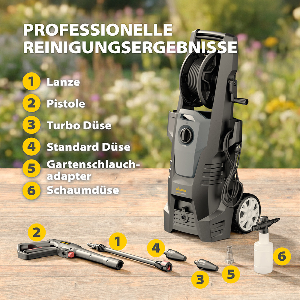 Die Kombination aus Standard- und Turbodüse, integriertem Reinigungsmitteltank und Schaumdüse ermöglicht professionelle Ergebnisse bei Fahrzeugen, Terrassen, Fassaden und mehr.